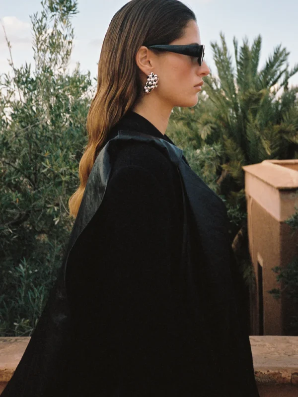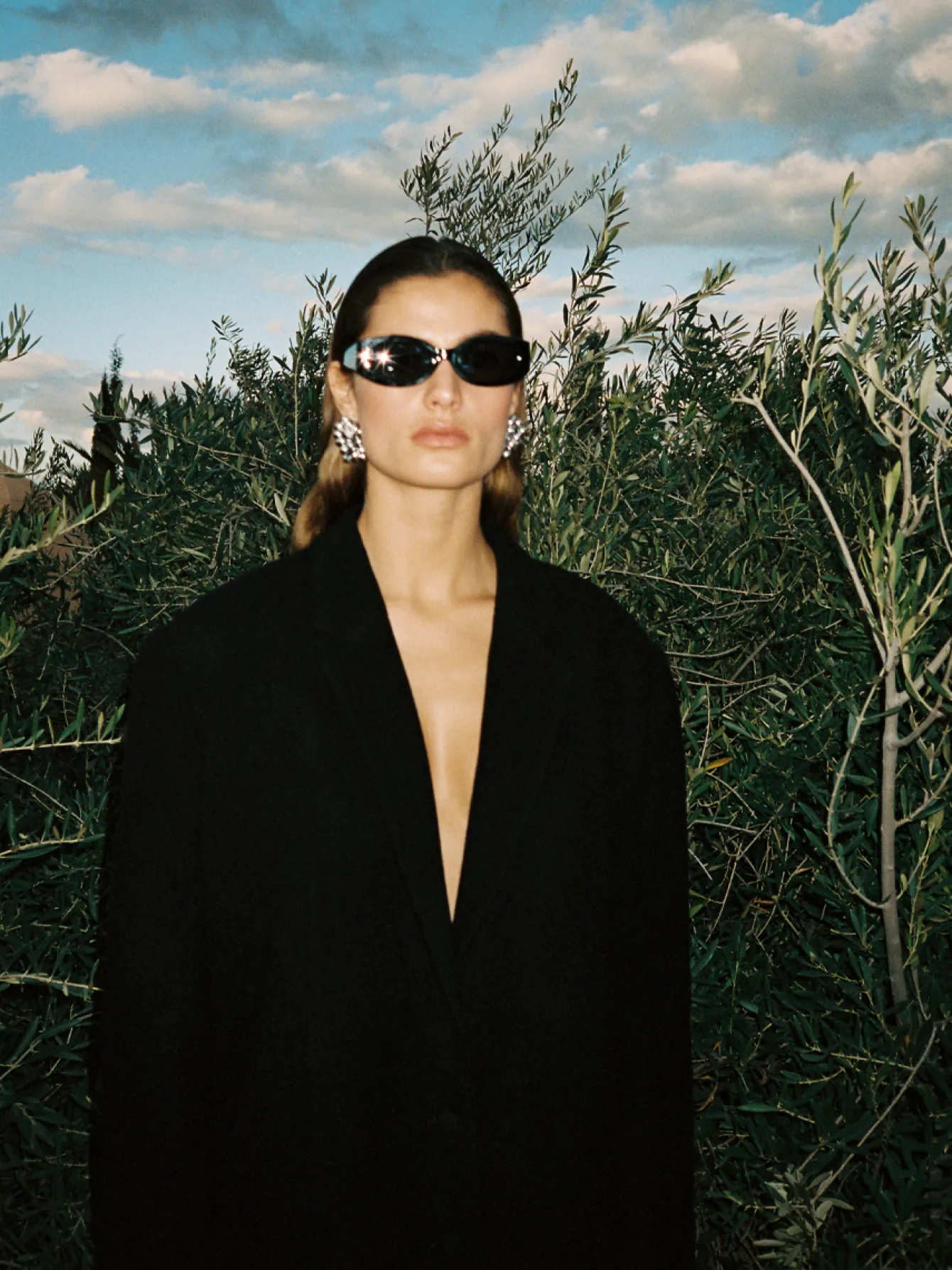 Oversized, tailored blazer coat, mid calf length. It has front flap pockets, a lapel collar and a slitted back.